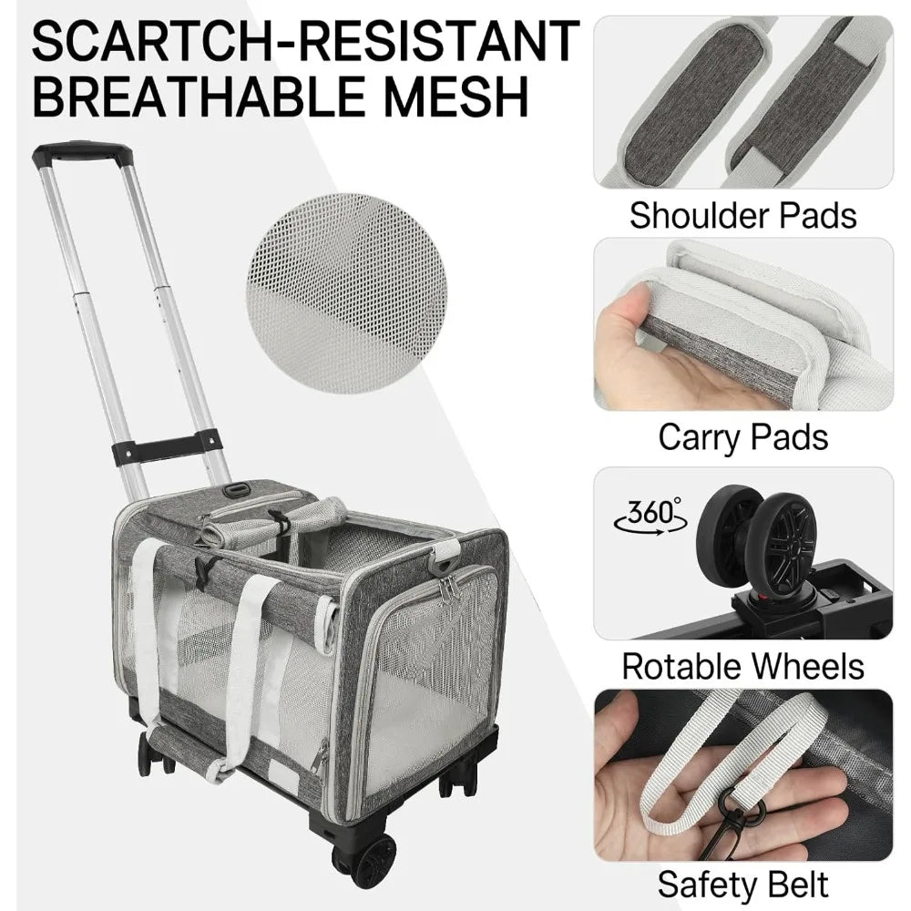 - Effortless Mobility with 360° Rotating Wheels - Navigate through airports, streets, and vet visits with ease using the smooth, ultra-quiet 360° rotating wheels. The detachable chassis allows seamless switching between rolling and handheld modes, while the three-stage retractable handle locks securely in place for customized height adjustment.